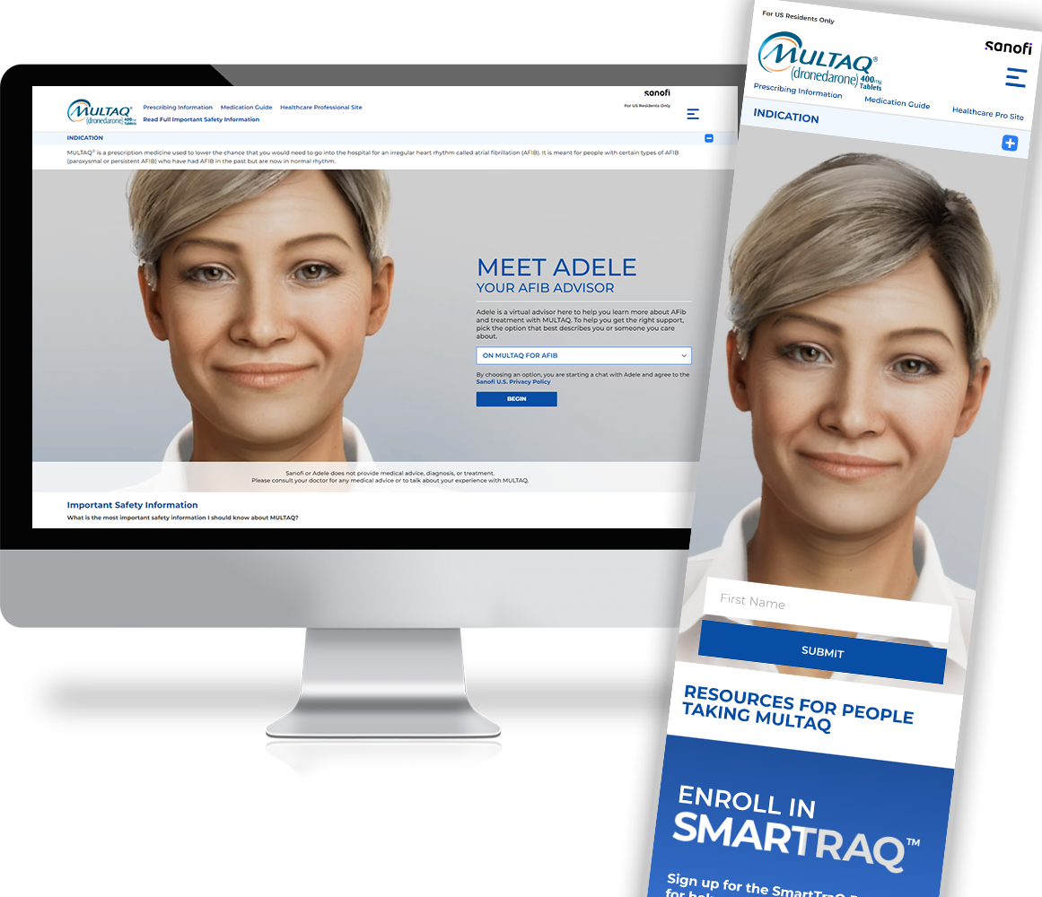 The first Digital Human in the Pharmaceutical industry to serve up engaging content informed with a behavioral science approach to help support and guide the patient and caregivers who are looking for more information on Atrial Fibrillation and Multaq.
