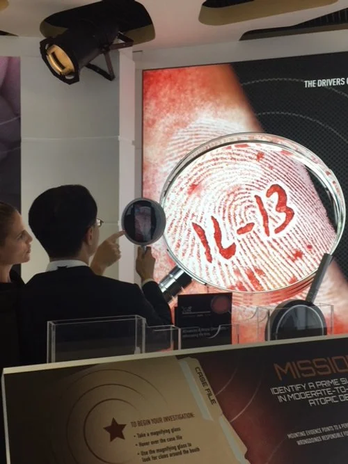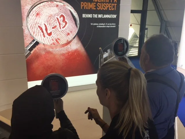 This unbranded experience for Tralokinumab was a convention initiative inclusive of banner ads, a content capsule, and trade ads, all driving users to visit our booth where our audience would be given a magnifying glass that contained a phone. Their objective was to act as a detective and gather clues through a series of interactive augmented reality experiences. Upon completion of their task, they were guided to a tabletop experience activated by the magnifying glass where they would finalize and identify the prime suspect in atopic dermatitis.